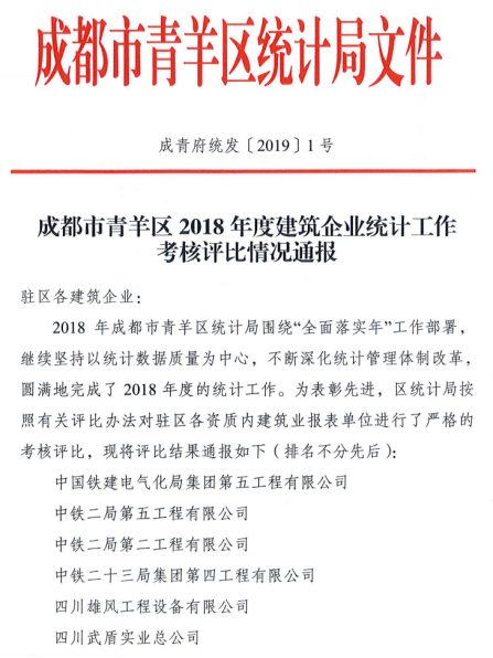 集團(tuán)公司、華途公司、華霆公司統(tǒng)計(jì)工作獲青羊區(qū)統(tǒng)計(jì)局表彰