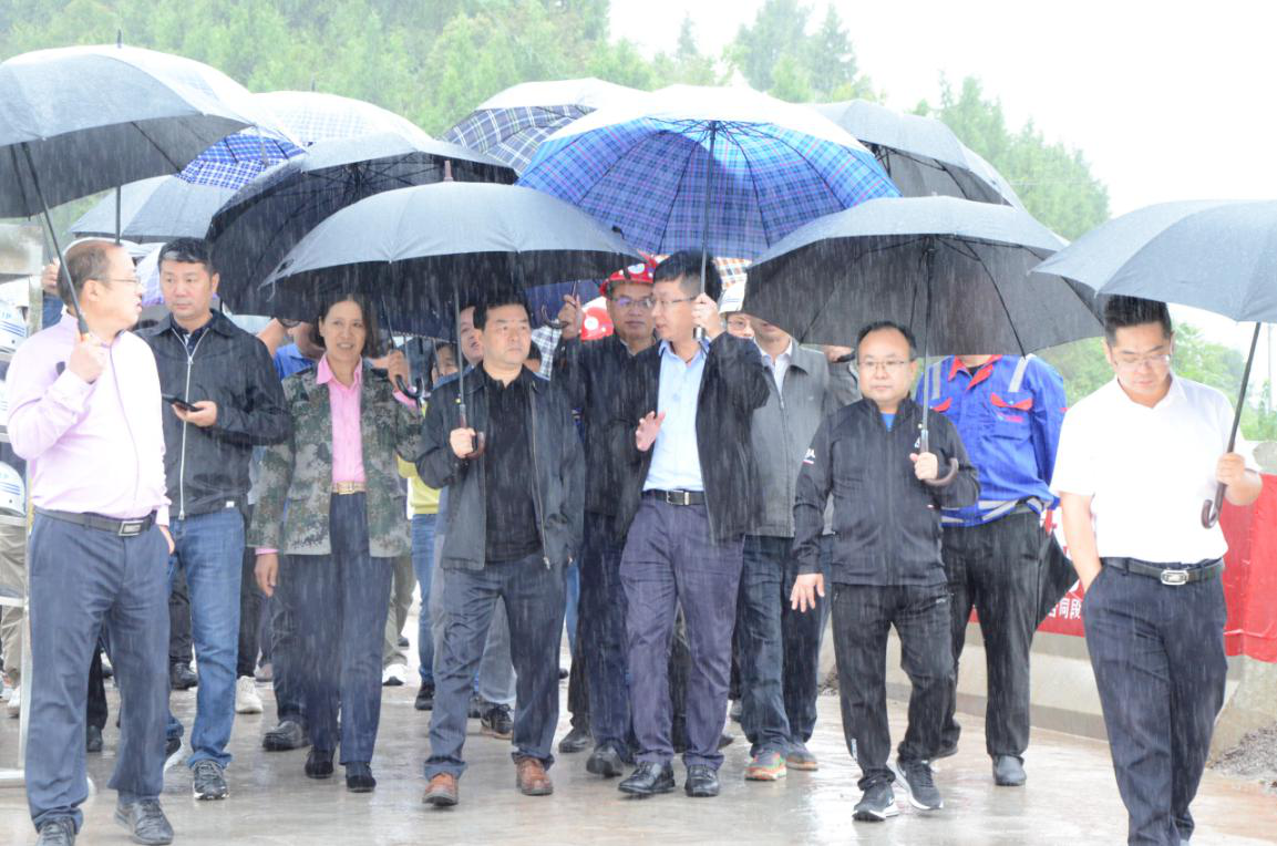 9月17日,集團(tuán)黨委書記、董事長、總裁謝應(yīng)文、常務(wù)副總裁駱曉紅等領(lǐng)導(dǎo)率集團(tuán)各職能部門負(fù)責(zé)人,在營達(dá)項(xiàng)目向年底通車目標(biāo)發(fā)起總攻、決戰(zhàn)決勝的關(guān)鍵時(shí)刻,冒雨深入營達(dá)高速項(xiàng)目施工一線現(xiàn)場督導(dǎo)慰問。營達(dá)公司總經(jīng)理謝應(yīng)武及參建單位負(fù)責(zé)人等陪同。